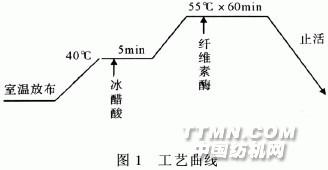 1 實(shí)驗(yàn) 1.1 實(shí)驗(yàn)材料 純棉纖維針織坯布,9.7tex緊密紡紗線,1/1雙羅紋,155 g/m2。纖維素酶T-VG,冰醋酸,滲透劑等。 1.2 實(shí)驗(yàn)儀器 PYROTEC2000紅外線染色機(jī),YT-811E型 織物懸垂性測(cè)試儀,YG(B)026E型電子織物強(qiáng)力機(jī),pH計(jì)。 1.3 實(shí)驗(yàn)方法 1.3.1 預(yù)處理 工藝條件:80℃×10 min 工藝流程:升溫加熱80℃→溫控→80℃→ 洗水10 min→取布→脫水 1.3.2 拋光處理 工藝處方: 纖維素酶T-VG(%) 1∶1·5(o.w.f.) 溫度(℃) 55 時(shí)間(min) 60 pH值 5·0 浴比 1∶10 工藝流程: 放布入機(jī)器→加水→調(diào)節(jié)pH為5·0→升溫 55℃→溫控→55℃→備料→放纖維素酶T-VG →運(yùn)行60 min→止活處理→排水 工藝曲線見圖1。.jpg)