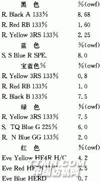1.3 固色劑和柔軟劑的相容性實(shí)驗(yàn)按照下面3種情況,將固色劑R-250分別和柔軟劑S/43、柔軟劑CAM-100、柔軟劑Lustraffin BA配成溶液。(1)R-250(4 g/L)+ S/43(6 g/L);(2)R-250(4 g/L)+CAM-100(6 g/L);(3)R-250(4 g/L)+CAM-100(6 g/L)+Lus—traffin BA(2 g/L)。然后,在1500 r/min的速度下攪拌20 min,靜置,每隔2 h觀察溶液是否有沉淀或浮油。1.4 染色、固色和過柔整理的方法將經(jīng)過煮練或酶洗后的純棉雙珠織物進(jìn)行染色和后整理,然后熱定型。工藝處方為:染料(按顏色處方);元明粉90 g/L,純堿20 g/L,浴比15:1,固色劑3 g/L,柔軟劑4 g/L。染色工藝流程為:進(jìn)水、進(jìn)布(5 min)--加入染料(10 min)一升溫至6O℃(紅色升溫至8O℃)一加入元明粉(20 min)--,加入純堿(90 min)--排水一冷水洗(5 min)一冷水洗(5 min)一中和(10 min,HAc 0.5 g/L)--95℃皂煮(15 min,2 g/L)一95℃皂煮