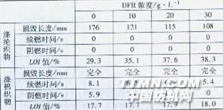 2.2.2滌綸和滌棉織物的DFR整理[6] 采用不同濃度的滌綸阻燃劑DFR,以高溫高壓法分別對(duì)滌綸和滌棉織物進(jìn)行整理,整理效果如表3。表3滌綸和滌棉織物經(jīng)不同濃度DFR整理的垂直燃燒試驗(yàn)