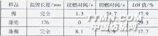 2 結(jié)果與討論 由于沒(méi)有取得與滌棉織物同源的純棉和純滌綸織物,因此本試驗(yàn)比較的滌棉、純棉和純滌綸三種織物燃燒性能的數(shù)據(jù),可能因非同源而存在些許差異。2.1未整理織物的燃燒性能 對(duì)滌棉混紡織物進(jìn)行阻燃整理之前,首先測(cè)定其燃燒性,并與棉和滌綸的純紡織物進(jìn)行比較,結(jié)果如表l所示。表1 未整理棉、滌綸和滌棉織物的燃燒垂直試驗(yàn)