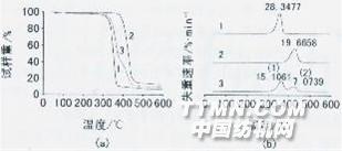 圖1未整理棉、滌綸和滌棉織物的TG與DTG曲線(xiàn) 由TG曲線(xiàn)[圖1(a)]知,試樣l(棉)和試樣2(滌綸)分別在不同的溫度區(qū)間內(nèi)有一次明顯的失重,而試樣3(滌棉)卻有兩次不同程度的失重。對(duì)應(yīng)的DTG曲線(xiàn)圖1(b)中試樣3的(1)峰主要是棉,(2)峰主要是滌綸。表2是上述三個(gè)試樣失重峰的主要參數(shù),包括最大分解速率及其溫度、殘?jiān)康?。?未整理棉、滌綸和滌棉織物的熱重分析數(shù)據(jù).jpg)