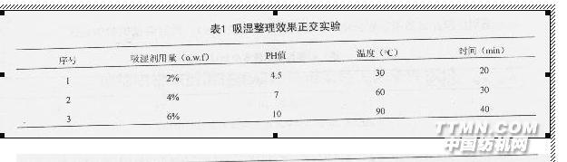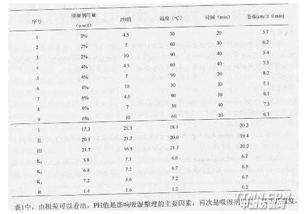 滌綸織物具有成本低,織物強(qiáng)度高的特點(diǎn),目前用量約占市場(chǎng)的一半,但滌綸織物的吸濕和透氣性差。穿著舒適性難如人意,易產(chǎn)生靜電。在生產(chǎn)使用過程中帶來較多麻煩甚至危害。滌綸織物耐久性親水整理,已是目前提高滌綸吸濕性的重要手段。為此我們利用魯?shù)婪蚬镜腇ERANICE吸濕劑從整理的工藝因素和整理方法入手來改變滌綸織物的性能。使之具有天然纖維所特有的舒適透氣性。 目前滌綸耐久性親水劑結(jié)構(gòu)主要為聚酯和聚醚嵌段共聚物。其中聚酯鏈段可以和滌綸產(chǎn)生共結(jié)晶。從而使大分子錨在滌綸織物表面。使助劑有較好的耐洗滌性。而聚醚鏈段起到親水的效果。從而使滌綸織物達(dá)到穿著舒適性(1)。1實(shí)驗(yàn)1.1實(shí)驗(yàn)材料1.1.1織物:滌綸織物9.8×9.8×390×2801.1.2藥品:德國魯?shù)婪蚧篬公司FE鼬州ICE,燒堿(分析純),保險(xiǎn)粉(分析純),'懶IJJFC。1.1.3儀器:電熱恒溫水浴鍋,毛效測(cè)試儀,RJll80高溫高壓染樣機(jī)。1.1.4 測(cè)試:吸濕效果用毛效測(cè)試法,根據(jù)織物3 O分鐘毛效的高低,比較吸濕效果。耐洗牢度測(cè)試采用,紡織品實(shí)驗(yàn)用家庭洗滌和干燥程序,GB/T86292001。1.2堿浴處理 堿浴處理可以使滌綸產(chǎn)生‘‘堿剝皮’’的效果,改變滌綸纖維的光潔度,使其表面微孔增多,有利于后面的親水整理。但堿浴條件不能太劇烈,以免使滌綸減量過多,改變織物豐格。 處方: 燒堿 2g/L 保險(xiǎn)粉l g/L JFC 1g/L 浴比 1:20藝藝流程: 90。C處理20—30min一80。C熱水洗一60。C熱水洗一冷水洗一酸中和一水洗一脫水----烘干。1.3吸濕整理 將織物前處理后,測(cè)得毛效平均是3.1cm/30min,采用正交實(shí)驗(yàn)法優(yōu)選吸濕整理工藝。根據(jù)整理的影響因素選擇優(yōu)擇4因素,每個(gè)因素取3個(gè)水平,浴比1:20,織