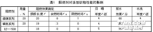 DJ一508是一種磷氯型阻燃劑,由表1可看出,在不影響涂層織物日曬牢度、水洗牢度的情況下,DJ一508具有很好的阻燃效果,而且不會影響織物的拒水性,對出口產(chǎn)品的環(huán)保檢測也無影響。