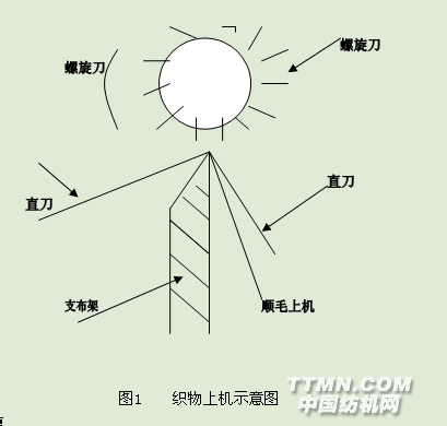 如圖1所示,順毛上機(jī)。毛圈經(jīng)支布架頂點(diǎn)時(shí)較易被銜入、剪斷,且剪后的絨毛較高,耗毛量較底,逆毛上機(jī)毛圈的傾斜方向與螺旋刀旋向一致,刀口處毛圈不易被銜入,剪毛效果差。因此,我們采用順毛上機(jī)。