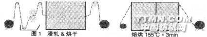 在后焙烘工藝中,使用樹脂、催化劑和添加劑,但控制其烘干溫度使得其不發(fā)生交聯(lián),然后直接裁制成服裝,再熨燙平整成需要的摺裥或折縫,最后將服裝通過焙烘進行交聯(lián)。后焙烘。加工流程 (圖3)如下: