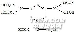 三聚氰胺很易和甲醛反應(yīng),非環(huán)氮原子上的氫原子被羥甲基取代,生成六羥甲基三聚氰胺,很大數(shù)量上用在“洗可穿”整理中。六羥甲基三聚氰胺樹脂初縮體的穩(wěn)定性較高,在中性水溶液中可保持數(shù)天,在織物上的整理效果持久性強,是棉織物使用的重要樹脂整理劑。甲醚化羥基甲基三聚氰胺樹脂MMM(Methoxy methylmelamine),是用甲醇進行醚化改性的羥甲基三聚氰胺樹脂初縮體。甲醚化三羥基甲基三聚氰胺MTMM樹脂,結(jié)構(gòu)為: