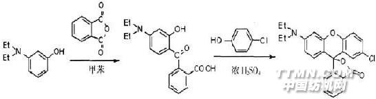 王永安,茅佩卿,程水良,婁紹杰,項(xiàng)斌 0 引言 隨著計(jì)算機(jī)和傳真的廣泛應(yīng)用,對(duì)壓敏記錄紙的需求量急劇增加。目前,全世界壓敏染料年產(chǎn)量約2000t[1]。熒烷類作為第三代壓、熱敏染料,它與三苯甲烷類和內(nèi)酯類敏感染料相比, 具有以下優(yōu)點(diǎn):靈敏度高,發(fā)色密度大,穩(wěn)定性好,在熒烷母體上容易引入不同取代基如烷基、氨基,烷取代氨基、鹵素、羥基、烷氧基、酰基、芳香基、雜環(huán)、苯并環(huán)[1]等等,可以得到各種顏色,特別是黑色的壓、熱敏染料[3],被認(rèn)為是最有發(fā)展前途的[2]。因此廣泛應(yīng)用于熱打印紙、傳真用紙及壓敏記錄紙等方面[4]。在我國(guó),熒烷類壓敏、熱敏染料正在開(kāi)發(fā)之中,隨我國(guó)經(jīng)濟(jì)的快速發(fā)展,對(duì)此類產(chǎn)品的需求日益增長(zhǎng),市場(chǎng)潛力巨大,此類染料的開(kāi)發(fā)成功將帶來(lái)不可低估的經(jīng)濟(jì)效益。 目前國(guó)內(nèi)已經(jīng)研制出黑色熒烷類染料,但對(duì)有色熒烷染料的研究的還很少[5]。這些有色熒烷染料廣泛應(yīng)用于示溫涂料、示溫墨水、熱敏服裝、熱敏防偽,且生產(chǎn)工藝簡(jiǎn)單,價(jià)格低廉,在市場(chǎng)上極具競(jìng)爭(zhēng)力,基于以上原因,我們對(duì)紅色熒烷染料3-二乙氨基-7 氯熒烷進(jìn)行了合成與研究。本文以間二乙氨基苯酚為原料合成KETO 酸,之后再與對(duì)氯苯酚反應(yīng)得到。合成路線如下: