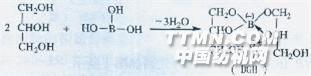 1.3合成方法 在裝有攪拌器、溫度計和真空導氣管的磨口三口燒瓶(250 mL)中,按量比為1.05:2加入硼酸與甘油,并加入少量對甲苯磺酸,開啟攪拌器.逐漸升溫到11O~120 ℃,抽真空,并保溫反應2~3 h,得無色透明粘稠液體,即為中間體DGB.1 3.2中間體(DDYP)的合成