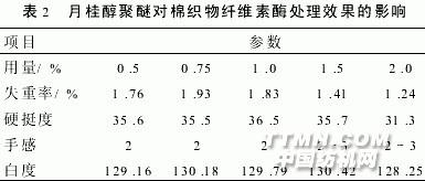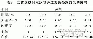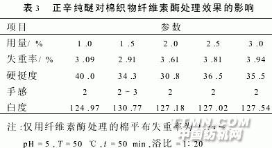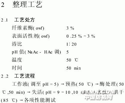 用酸性纖維素酶(諾維信公司CellsoftL型)、陰、陽、非離子表面活性劑、蒸餾水、酷酸鈉一酷酸、純堿同浴,對28x28/236x236純棉漂白布進行整理.然后利用DT一100型單臂分析天平J刀02電熱鼓風干燥箱、昭D一111型白度儀和45度斜面硬挺度測試儀分別測試織物的失重率、硬挺度和白度.失重率為處理前后布樣重量之差除以處理前布樣干重.硬挺度參照標準FJ 552.4一85.織物的手感由專家小組評定,1級手感為最差,5級手感為最好.白度參照標準GB 8425一87..jpg)