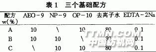 二種消泡硅油:二甲基硅油(2號),苯基硅油(3號)1.2 主要原料和儀器非離子表面活性劑0P-10,AEo-9,NP-9均為工業(yè)級,廣州美麗華日化原料公司提供;- 甲基硅油,苯基硅油均為工業(yè)級,廣東標(biāo)美硅氟精細(xì)化工研究所有限公司提供;去離子水和EDTA-2Na,深圳順友升公司提供;CS501型超級恒溫水浴及羅氏泡沫儀;TJ-1精密增力電動攪拌器;FAg104 型精密電子天平。1.3 測定方法按國家標(biāo)準(zhǔn)(QB/]'1974—94)中的測定方法分別測定各個樣品的泡沫高度、粘度和pH值。2 實驗結(jié)果與討論在三個基本配方中分別以0.1% 0.2% 0.3%0.4%0.5% 1% 的加入量加入各種硅油,然后分別測其當(dāng)時和5min之后的泡沫高度,再畫出泡沫高度H(mL)與消泡劑的質(zhì)量分?jǐn)?shù)C(%)的關(guān)系圖。2.1 配方A與消泡劑的實驗.jpg)