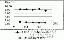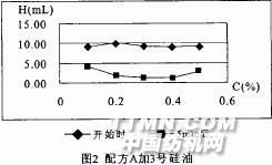 觀察圖1和圖2可得出,2號硅油對配方A的消泡效果最好,但水溶性較差,在0.4% 時即會分層,雖可使泡沫減少到較低的高度,但對H開始時影響不大;3號硅油對配方A有一個最佳消泡濃度,但在0.5% 時也會分層且不夠低,是在0.3%時可將H降低到小于