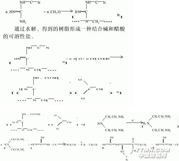 這類固色劑的固色機(jī)理主要是絡(luò)合陽離子和染料的RSO 3陰離子形成鹽(色淀),從而提高染料的色牢度。 固色劑M是固色劑Y與銅絡(luò)合的衍生物。固色劑Y主要用于直接染料和若干弱酸性染料的固色,一般不用于活性染料。其主要問題是存在游離甲醛。由于對甲醛危害的重視和嚴(yán)格要求,自80年代以來,固色劑Y逐漸被無甲醛固色劑所替代。 1.2 第二代固色劑:多胺類樹脂固色劑 多胺(主要如二乙撐三胺)與胍及其衍生物(主要如雙氰胺)的縮合樹脂,是20世紀(jì)60年代初開發(fā)的無甲醛固色劑,這是固色劑發(fā)展的第一個(gè)飛躍。由于其性能優(yōu)于固色劑Y,特別是能提高活性染料的耐洗牢度,隨著80年代以來對無甲醛固色劑的要求,這類固色劑就得到了大的發(fā)展和應(yīng)用,種類較多。多胺固色劑是在酸(無機(jī)酸或有機(jī)酸或其釋酸鹽)存在下,二乙撐三胺與雙氰胺反應(yīng),經(jīng)縮合、脫氨、環(huán)化成咪唑啉結(jié)構(gòu)并經(jīng)縮聚,形成高分子化合物。