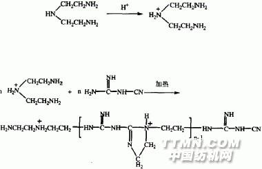 1.2 制備方法 第一步:將二乙烯三胺加入到反應容器中,邊攪拌邊緩慢加熱,同時加入等摩爾氯化銨,于90℃反應1h,將反應溫度升至100℃,迅速加入等摩爾雙氰胺,繼續(xù)升溫至150℃左右,反應1.5h。反應過程中會放出大量氮氣,需用接收裝置收集,反應物的粘度隨反應的進行不斷增加,反應結(jié)束后,將反應物快速加入一定量的水中,攪拌后