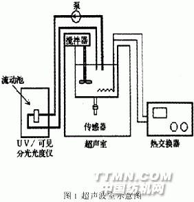 1 實(shí) 驗(yàn) 超聲波發(fā)生器(ShinHanUltrosonicsCo.,Korea):28kHz,154W,不銹鋼圓形室,鈦酸鋇壓電傳感器固定在圓形室的底部。產(chǎn)生超聲波氣穴的合適頻率為5kHz~50kHz。為了測試有超聲波和無超聲波照射下染料分散體中粒度的變化,用蒸餾水配制0.05g/l的染料溶液,將染料分散體循環(huán)放入U(xiǎn)V/可見分光光度儀(Unicam8700,U.K.)中的1cm流動池中,測染料分散體的濁度光譜。圖1所示為儀器的各部件分布。用粒度分析儀(Mastersizer,Malvern,U.K.)在50℃下測有超聲波和無超聲波照射下的粒度變化。