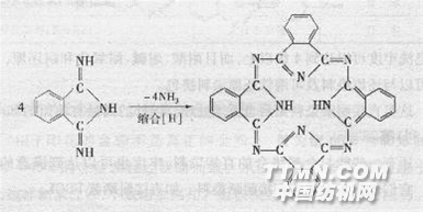 酞菁染料色澤鮮艷,而且耐曰曬、耐氣候、耐水洗和耐摩擦牢度都極優(yōu)良,是現(xiàn)用染料中最突出的品種,其缺點是色譜不全,只有藍、綠兩種色澤。 酞菁(phthalo cyanine,簡寫為PC)分子是由4個1,3一二亞氨基異氮茚(異吲哚啉)單體在有機溶劑中通過加熱,釋放出4分子的氨縮合而成。