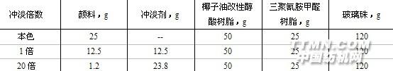 1.方法原理將顏料研磨于一定的介質(zhì)中,制成樣板,與日曬牢度藍(lán)色標(biāo)準(zhǔn)同時在規(guī)定的光源下曝曬一定時間后,比較其變色程度,以“級”表示。2.儀器設(shè)備 (1)電熱鼓風(fēng)箱、調(diào)墨刀、漆刷或噴槍、馬口鐵板、100目銅絲布、黑厚卡紙、書寫紙、(0~100)μm刮板細(xì)度計、1.5 kw氖燈日曬機(jī);(2)天平:感量0.2 g、0.0004 g; (3)小砂磨機(jī):電機(jī)轉(zhuǎn)速:2800 r/min;容器:內(nèi)徑65 mm,高115 mm;玻璃珠:直徑(2~3)mm; (4)日曬牢度藍(lán)色標(biāo)準(zhǔn)(GB 730-65); (5)染色牢度褪色樣卡(GB 250-64); (6)天然日曬玻璃框:以厚約3 mm均勻無色的窗玻璃和木框構(gòu)成,木框四周有小孔,使空氣流通,并不受雨水和灰塵的影響,曝曬試樣與玻璃間距為(20~50)mm。3.主要試劑 (1)椰子油改性醇酸樹脂:顏色:不大于8(鐵鈷比色計);粘度:25℃時(20~60)s(涂-4粘度計);酸值:不大于 7.5 mg/g;固體含量:(48~52)%。(2)三聚氰胺甲醛樹脂:顏色:不大于1(鐵鈷比色計);粘度:25℃時(60~90)s(涂-4粘度計);酸值:不大于 2 mg/g;固體含量:(58~62)%。(3)涂料用金紅石型二氧化鈦;(4)鉛錳鈷催干劑;(5)二甲苯。4.檢驗(yàn)步驟(1)試樣的制備 參照表9-12和表9-13,根據(jù)顏料品種和所需沖淡倍數(shù),按次序稱取椰子油改性醇酸樹脂、顏料、沖淡劑和玻璃珠,放入容器內(nèi),加入適量二甲苯,攪拌均勻并砂磨至細(xì)度30 µm以下,再加入所需的三聚氰胺甲醛樹脂及樹脂質(zhì)量0.2%的鉛錳鈷催干劑,攪拌均勻,用100目銅絲布過濾,以二甲苯調(diào)節(jié)至適宜制板粘度。表9-12 有機(jī)顏料