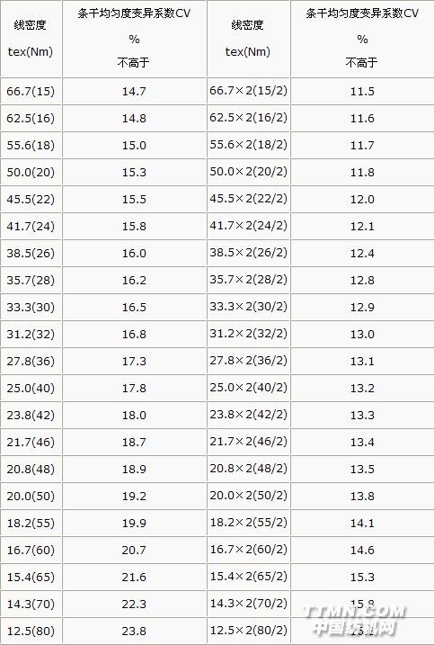 附錄B(規(guī)范性附錄)外觀疵點(diǎn)說明及計(jì)量方法B.1 毛粒 纖維糾纏成的結(jié)點(diǎn),直徑粗于正常紗的2.5倍及以上,長度1mm及以上。B.2 竹節(jié)紗 連續(xù)出現(xiàn)節(jié)粗、節(jié)細(xì)的紗線,直徑粗于正常紗的3倍及以上,長度2cm及以上。B.3 大肚紗 紗線局部直徑粗于正常直徑,呈棗核形,直徑粗于正常紗的3.5倍及以上,長度大于5cm。B.4 粗節(jié) 紗線直徑粗于正常紗的節(jié)段,直徑粗于正常紗的2倍及以上,長度1cm~4cm為短粗節(jié),4cm~8cm為長粗節(jié),8cm以上為超長粗節(jié)。B.5 細(xì)節(jié) 紗線直徑細(xì)于正常紗的節(jié)段,直徑細(xì)于正常紗的0.5倍,長度小于8cm稱短細(xì)節(jié),8cm及以上稱長細(xì)節(jié)。B.6 小辮紗、油污紗、多(缺)股紗、松緊紗、弓紗和雙紗等 按GB/T 5706-1985中的3.2規(guī)定。附錄C(規(guī)范性附錄)精梳機(jī)織毛紗條干均勻度變異系數(shù)優(yōu)等品考核指標(biāo) 精梳機(jī)織毛紗條干均勻度變異系數(shù)優(yōu)等品考核指標(biāo)見表C.1。表C.1.jpg)