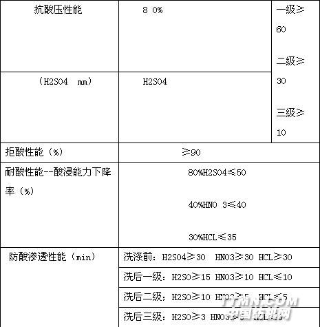 GB2012-89規(guī)定了衣料的抗酸壓性能、拒酸性能、耐酸性能