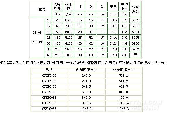 CSK-PP內(nèi)外環(huán)均有鍵槽,建議公差為內(nèi)環(huán)與工件軸心為k6公差,外環(huán)與工作壁為K6公差,若要采用滑配方式安裝,內(nèi)環(huán)與工作軸h6之公差或外環(huán)與機壁H6之公差亦可。鍵槽標(biāo)準(zhǔn)為DIN6885.3, 40號的為DIN6885.1。
