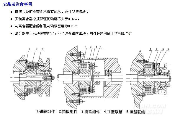 安裝離合器時,請配合一滾珠軸承,并注意軸心與外圈須保持同一中心,以防軸向應(yīng)力與徑向應(yīng)力,亦可參考安裝范例。