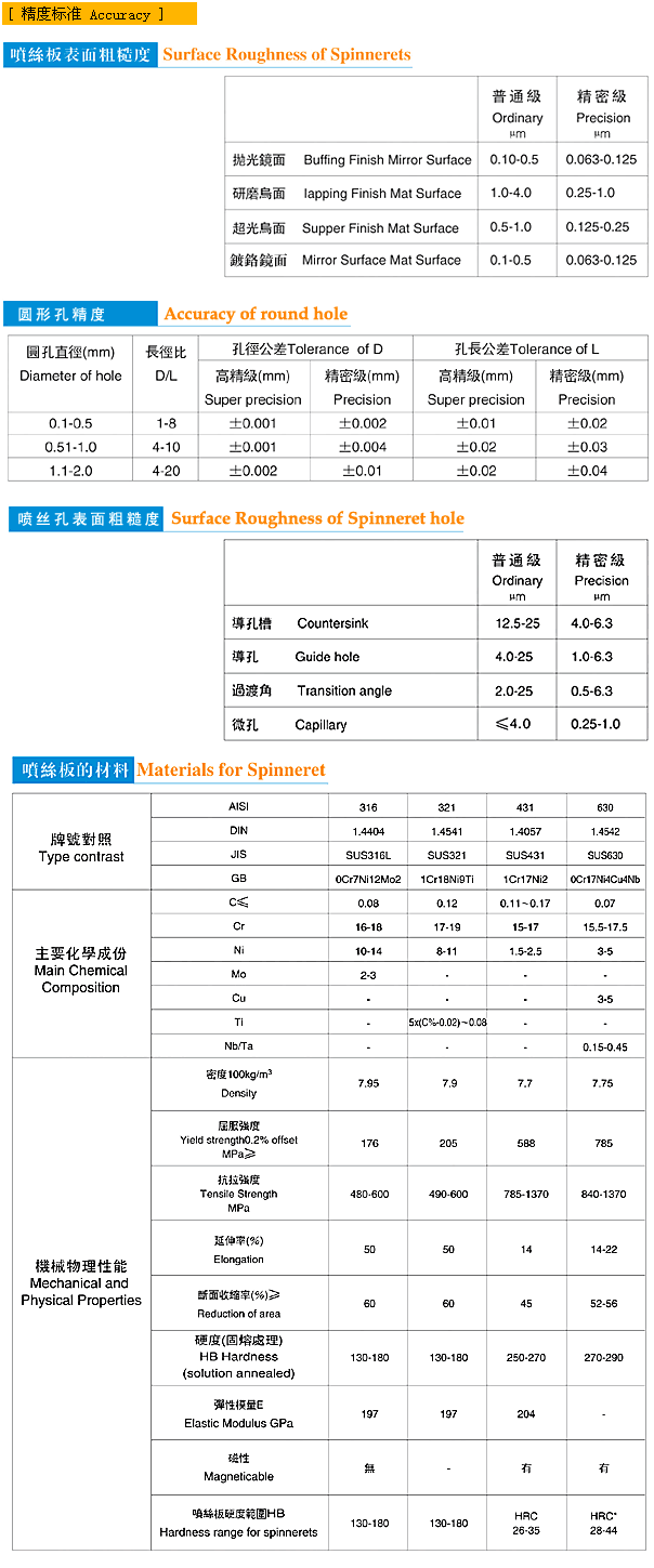 備注: 本公司生產(chǎn)的噴絲板和化纖紡絲組件采用進(jìn)口日本的不銹鋼SUS630、SUS431和SUS316。