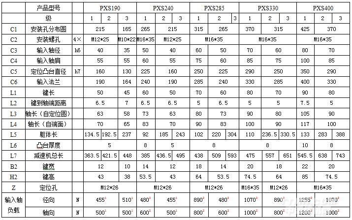 角標(biāo)“”在輸入轉(zhuǎn)速3000rpm時(shí),使用壽命作用于輸入軸中心位置(L/2處)之容許徑向力及軸向力備注:PXS系列除轉(zhuǎn)動(dòng)慣量與系列不同外,其余參數(shù)均可參考對(duì)應(yīng)的系列