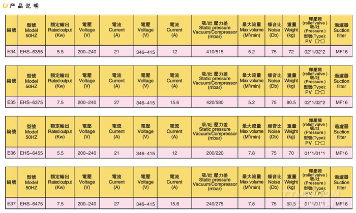 雙段鼓風(fēng)機(jī)EHS6355/6375產(chǎn)品規(guī)格: