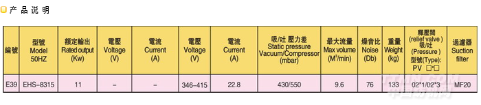 雙段鼓風(fēng)機(jī)EHS8315(旋渦氣泵)是一種吹氣或吸氣兩用的通用氣源。風(fēng)機(jī),高壓風(fēng)機(jī),鼓風(fēng)機(jī),升鴻高壓風(fēng)機(jī),瑞昶風(fēng)機(jī),旋渦氣泵,吸風(fēng)泵,吸料風(fēng)機(jī),真空泵,側(cè)流風(fēng)機(jī)它主要用于:切紙機(jī),燃燒降氧機(jī)、卷煙濾嘴成型機(jī)、電鍍槽液攪拌、霧化乾燥機(jī)、水處理爆氣、水產(chǎn)、絲網(wǎng)印刷機(jī)、照相制版機(jī)、注塑機(jī)自動(dòng)上料烘干機(jī)、液體灌裝機(jī)、粉末灌裝機(jī)、電焊設(shè)備、電影機(jī)械、紙張運(yùn)送、清潔用途、空氣除尖、干瓶、氣體傳送、送料、收集等方面 功率:0.18KW 0.4KW 0.75KW 1.1KW 1.75KW 2.2KW 3.7KW 4KW 5.5KW 7.5KW 9KW 13KW 20KW EHS-129 EHS-229 EHS-329 EHS-339 EHS-429 EHS-439 EHS-529 EHS-629 EHS-639 EHS-729 EHS-829 EHS-919 EHS-929 EHS-939 EHS-4337 EHS-4346 EHS-6346 EHS-6355 EHS-6375 EHS-6455 EHS-6475 EHS-8310 EHS-8315 EHS-8320 EHS-8410 EHS-8415 EHS-9320 EHS-9325 EHS-9420 EHS-9425 風(fēng)壓:50mbar~650mbar 風(fēng)量:40立方/小時(shí)~1134立方/小時(shí)(為方便選用不同規(guī)格,單段式/雙段式均有貨提供) 頻率:50Hz/60Hz 電壓:110V~615V(萬國(guó)電壓,各國(guó)均可使用。如需特殊電壓,可按要求定做) 釋壓閥 RV-01 RV-02(配套使用) 過濾器 MF8 MF10 MF12 MF16 MF-20 MF-32 本公司有專業(yè)的相關(guān)技術(shù)工程師,歡迎廣大客戶來電來函咨詢相關(guān)業(yè)務(wù)--風(fēng)機(jī),高壓風(fēng)機(jī),鼓風(fēng)機(jī),升鴻高壓風(fēng)機(jī),瑞昶風(fēng)機(jī),旋渦氣泵,吸風(fēng)泵,吸料風(fēng)機(jī),真空泵,側(cè)流風(fēng)機(jī)。