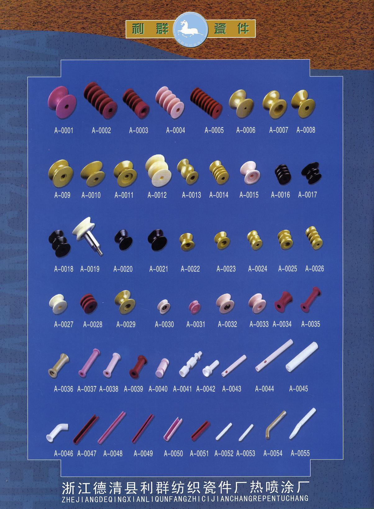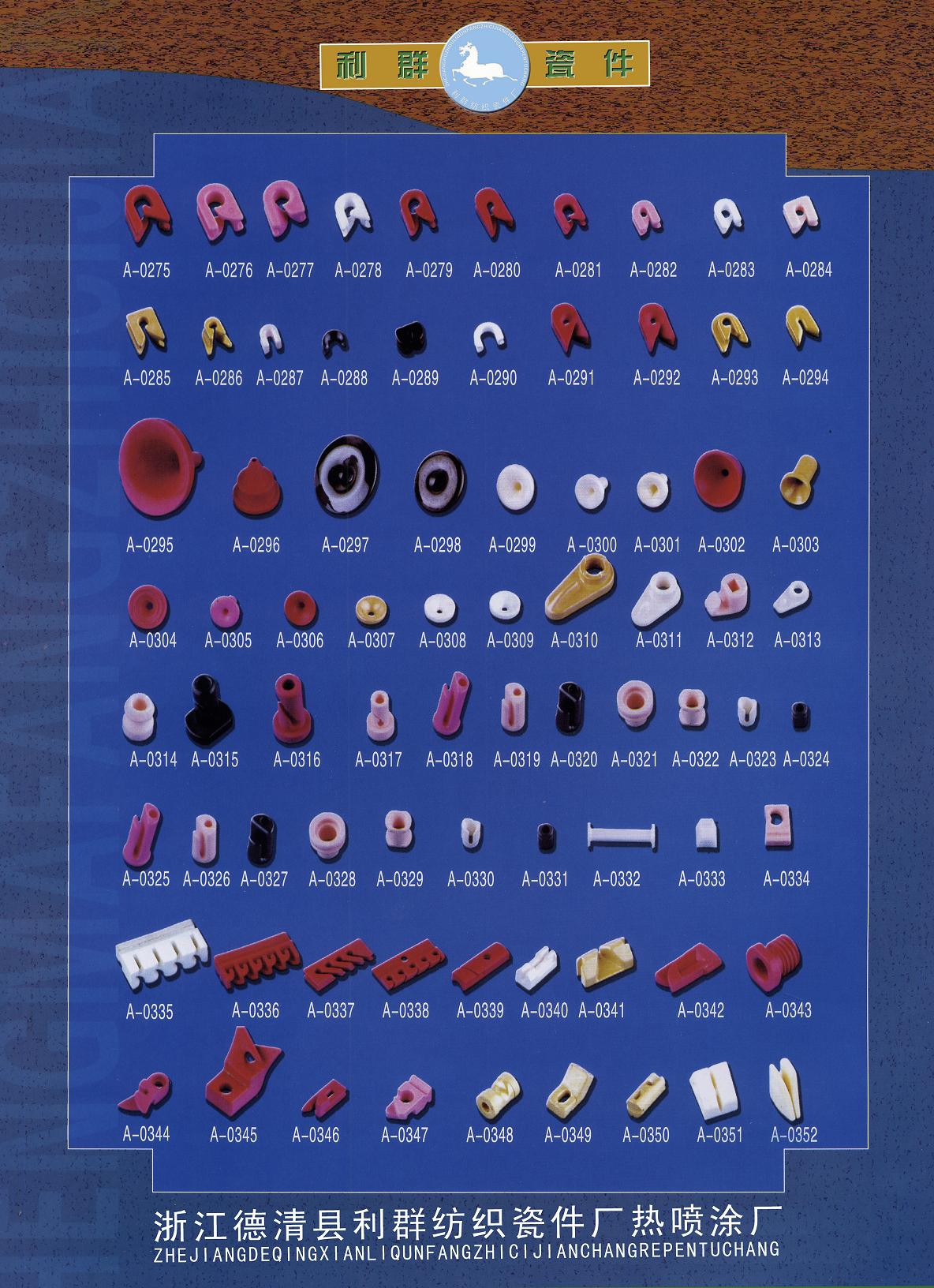 浙江省德清縣利群紡織瓷件廠是普瓷、九五瓷、九九瓷、鈦瓷的專業(yè)生產公司。適用于各種細紗機、氣流紡紗機、倍捻機、絡筒機、并紗機、捻線機、劍桿織機、噴氣織機、噴水織機、勾編織機、各式整經機、大圓機、織襪機、包覆機、加彈機、卷繞頭、紡絲機、電腦繡花機、商標機、繞線機、電子清紗器、電子切絲器、電子感絲器、電子儲緯器及其他機械導絲器。來樣可定做,歡迎來電垂詢。