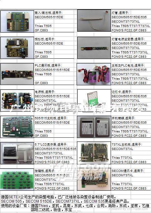 德國SETEX公司生產(chǎn)的染整電腦,已廣泛地被各染整設(shè)備制造廠使用。    SECOM 505,SECOM 515,SECOM 515DE,SECOM 737XL(早期型號:SC737XL),SECOM 535更是經(jīng)典產(chǎn)品。