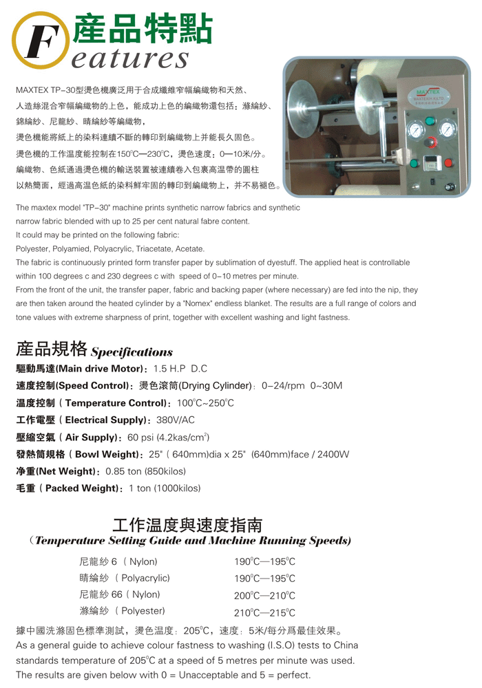 您所在的位置:紡機(jī)網(wǎng) >> 麥斯特(香港)有限公司廣州辦事處 >> TP-30窄幅條帶燙色機(jī)