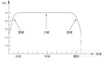 在小紗與大紗時(shí),主電機(jī)由變頻驅(qū)動(dòng),中紗時(shí)由工頻驅(qū)動(dòng)??捎行Ы档凸?,延長(zhǎng)變頻器使用壽命。