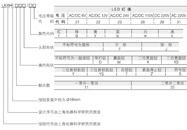 Φ16 LA39-E系列按鈕開關(guān)由組成頭部操作機構(gòu)的螺紋套部件和組成觸頭動作機構(gòu)的基座部件二大部件組成,其設(shè)計巧妙、外形美觀,體積小巧,安裝方便、接觸可靠,并采用防轉(zhuǎn)動機構(gòu),使按鈕安裝定位準確,防止松動。是用戶對面板小型化、集成化控制要求的最佳選擇。
