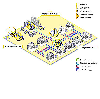 網(wǎng)絡(luò)的另一個(gè)功能是控制系統(tǒng),透過染廠網(wǎng)絡(luò)使流程之間相互調(diào)節(jié)和發(fā)揮最佳效能。還可聯(lián)系訂單管理到機(jī)器的控制單元上,從而組成一個(gè)完整的染廠網(wǎng)絡(luò)。