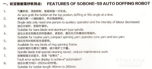 SOBONE S9環(huán)錠紗智能落紗機(jī)技術(shù)特點(diǎn)及參數(shù)介紹