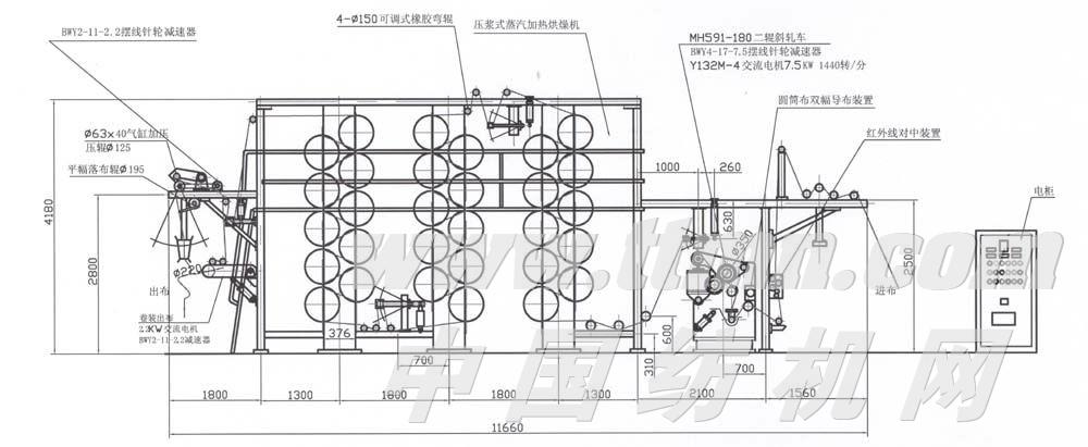 平幅進(jìn)布→MH591斜軋車→MH606三柱烘筒烘燥機(jī)→平幅、打卷兩用落布