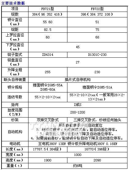 本機(jī)外形簡潔、墻板跨距小、剛性好、結(jié)構(gòu)穩(wěn)定。主電機(jī)安排在車尾,檢修及變換速度方便。錠子傳動采用滾盤及滾動軸承、雙張力盤,適合高速運轉(zhuǎn)及捻向變換。車頭傳動采用雙面捻度及適應(yīng)S.Z捻的傳動機(jī)構(gòu)。FB721采用雙排交叉、臥式筒子架,F(xiàn)B722采用三排交叉臥式筒子架,上下左右交叉排列。斷頭自停裝置采用插片式。錠子采用油膜阻尼吸震錠子,對速度適應(yīng)性廣,振動小。鋼令板,導(dǎo)紗板,氣圈環(huán)都采用牽吊式升降。升降系統(tǒng)自動化程度較高,操作簡便。通過輸送帶可將使用過的空筒管輸送到車尾。