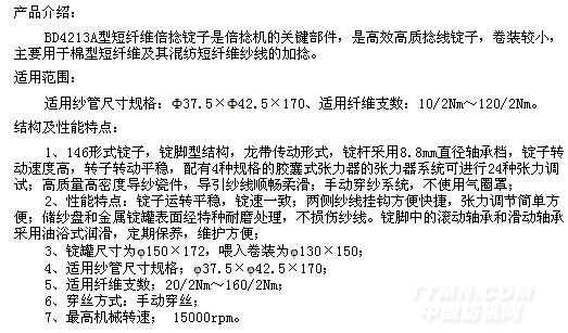 ????BD4213A型短纖維倍捻錠子是倍捻機(jī)的關(guān)鍵部件,是高效高質(zhì)捻線錠子,卷裝較小,主要用于棉型短纖維及其混紡短纖維紗線的加捻。