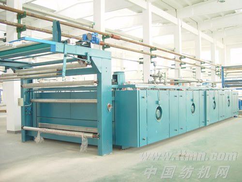 進(jìn)布有平進(jìn)或斜進(jìn)布兩種,烘房采用三層穿布,積木式設(shè)計(jì),每室烘房有二只循環(huán)風(fēng)機(jī)、四只散熱器,噴風(fēng)由上、中、下三處同時(shí)直接噴向織物表面。