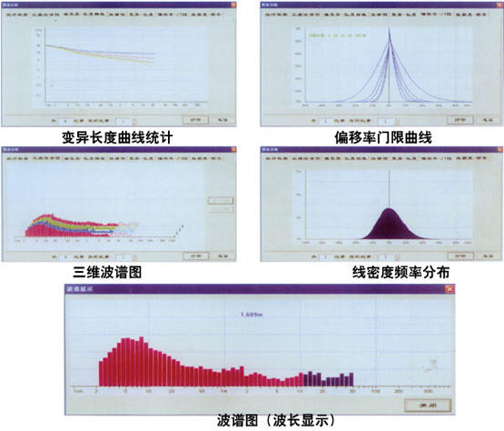 提供單管紗線波譜圖、不勻曲線圖、偏移率門限曲線、線密度頻率分布圖、變異長(zhǎng)度曲線圖、綜合統(tǒng)計(jì)分析、一組統(tǒng)計(jì)波譜圖、一組統(tǒng)計(jì)變異長(zhǎng)度曲線圖、4檔全部疵點(diǎn)值、AF值、2檔DR值統(tǒng)計(jì)、U值、5檔CVm值、CVb、Q95%、千米統(tǒng)計(jì)值。