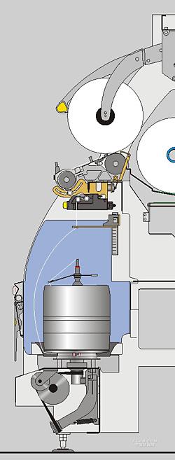 紗線沿著儲(chǔ)紗盤的溝槽出來然后形成環(huán)繞固定錠罐的氣圈。氣圈導(dǎo)紗鉤的位置以及在某些機(jī)器型號(hào)中配備的氣圈罩決定了氣圈的大小。