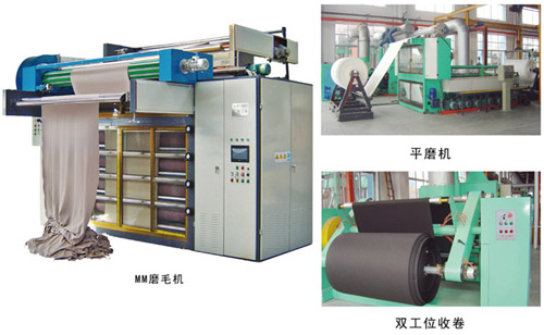 MW、MM系列多輥平磨機(jī),設(shè)有6~12支磨輥,采用多輥多次不同砂皮介質(zhì)對織物表面進(jìn)行磨削加工,達(dá)到表面光澤一致,并具獨特風(fēng)格的絨面。最新開發(fā)的MP立式磨毛機(jī)可同時磨削正反兩面,附加氣流除塵,實現(xiàn)雙面磨毛、清除皮粉一次完成,效率比同類設(shè)備高3倍以上。