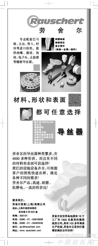 您所在的位置:紡機網(wǎng) >> 勞舍爾特種陶瓷(上海)有限公司 >> 紡織陶瓷