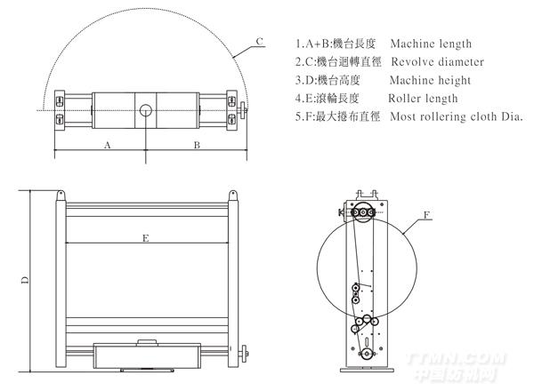 本機(jī)分(單面車與雙面車),(正轉(zhuǎn)車與逆轉(zhuǎn)車),其適用之機(jī)臺(tái)針筒,配合之滾輪長(zhǎng)度,布匹捲收直徑大小,機(jī)臺(tái)高度,所需迴轉(zhuǎn)直徑,均隨需求而改變,故於訂購(gòu)時(shí)依客戶需求再行研議。