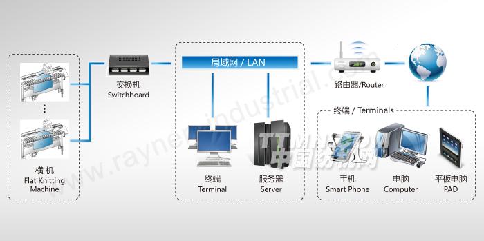 橫機(jī)網(wǎng)絡(luò)管理系統(tǒng)通過有線/無線局域網(wǎng)聯(lián)網(wǎng)技術(shù)與管理軟件,來控制和管理本地的橫機(jī)機(jī)群,用戶可以通過電腦、平板電腦、手機(jī)等終端來訪問管理軟件,實(shí)現(xiàn)對(duì)橫機(jī)的監(jiān)控和生產(chǎn)管理。
